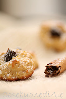 Distribuite il composto a mucchietti con un cucchiaino su una teglia rivestita con carta forno e completate con una mandorla o con dell'uva sultanina fatta rinvenire in acqua tiepida e strizzata.